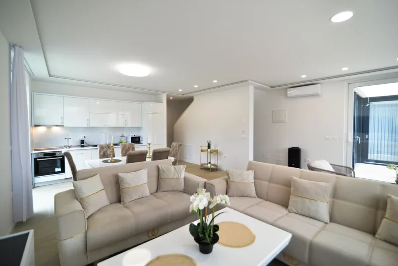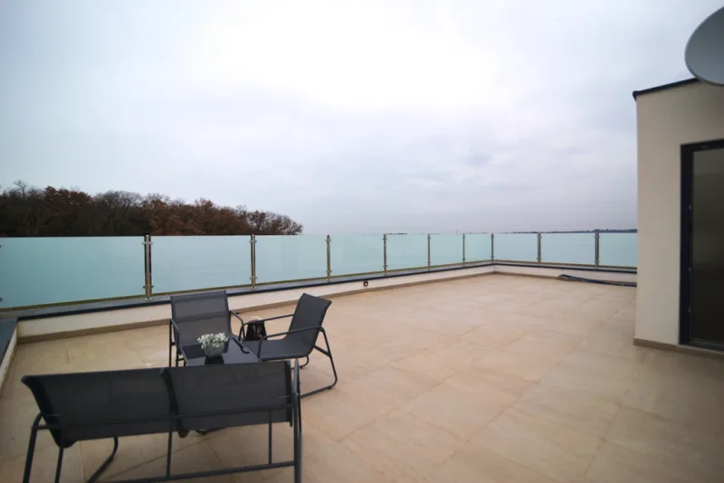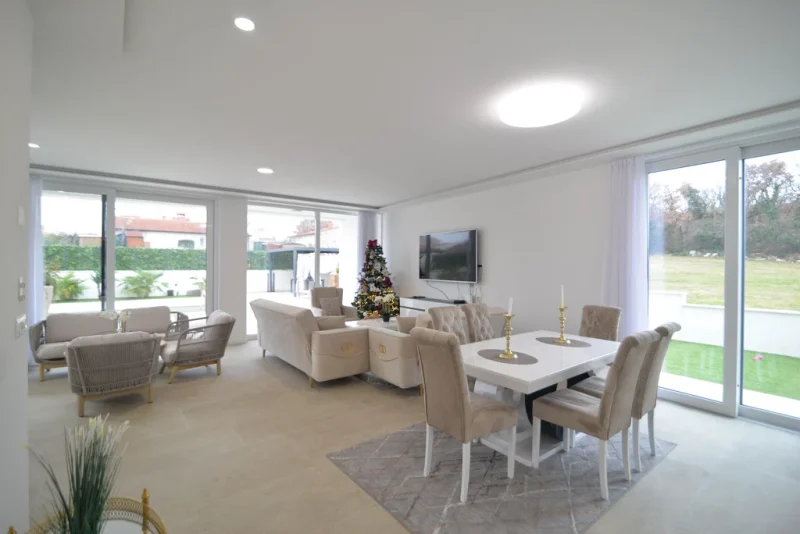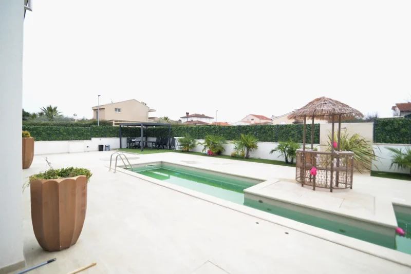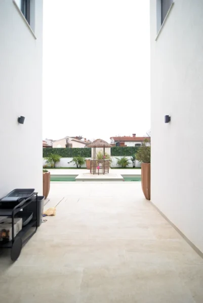 In a quiet location near Poreč, two modern family houses with a shared outdoor pool are for sale, built on a plot of 779 m². The property offers a total of 348 m² of net living space, distributed over the ground floor, first floor, and basement. Functional layout, wellness area, summer kitchen, and multiple parking spaces provide comfortable living or an excellent investment for tourist rental.